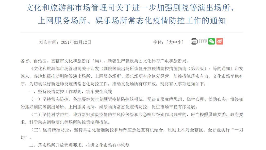 3月15日,文化和旅游部官网发布通知,疫情低风险地区,对剧院等演出场所、上网服务场所、娱乐场所接待消费者人数比例不再做统一限制,由各省(区、市)党委、政府根据当地疫情防控形势自行掌握。 具体内容如下: