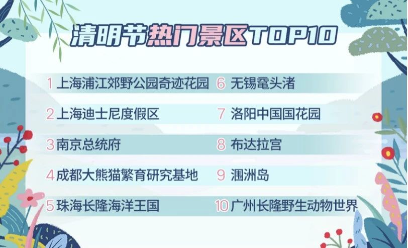 出游主题方面,花园花海、动植物园、城市公园、主题乐园、水族馆、博物馆、古镇是清明节最热门的几大景区类型。数据显示,上海浦江郊野公园奇迹花园、上海迪士尼度假区、南京总统府、成都大熊猫繁育研究基地等位列“清明节热门景区前十位”。