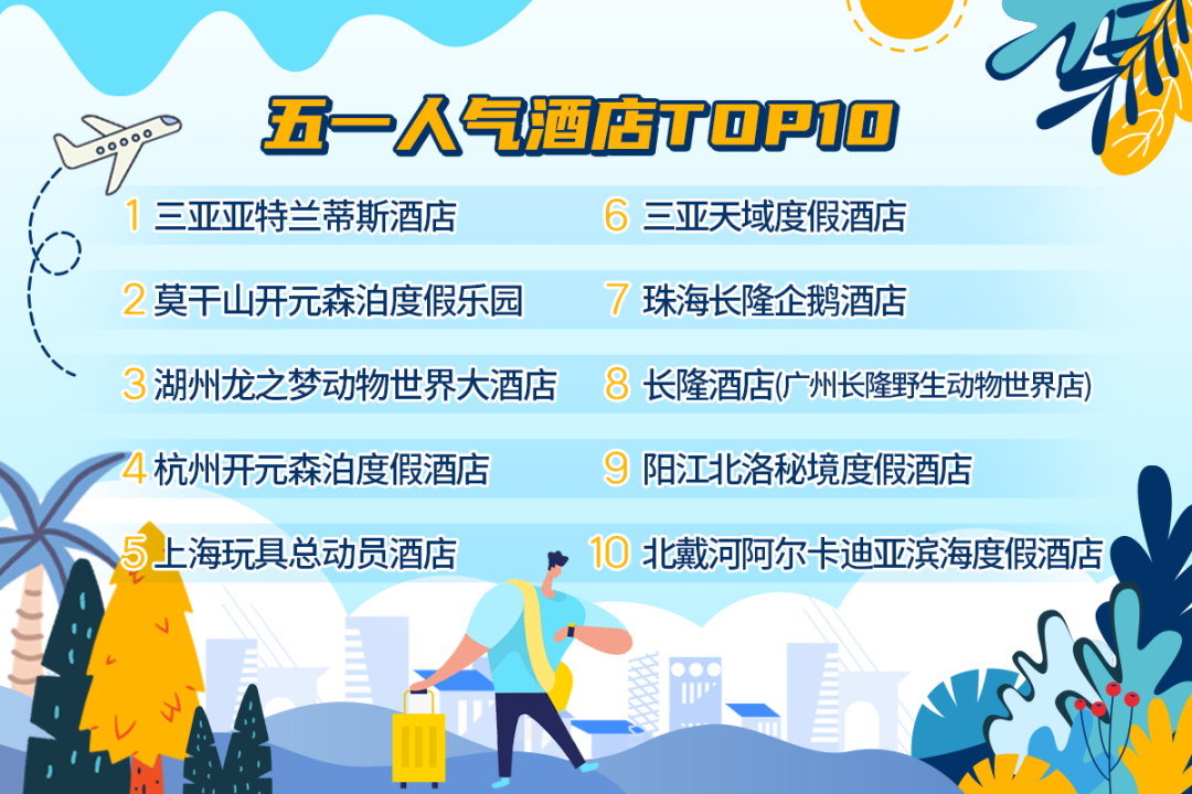 上海、北京、三亚、广州、成都、重庆、西安、厦门、杭州、深圳位列前十大出行目的地。从机票订单增长情况来看,扬州、舟山、北海、敦煌、恩施、海口、三亚成为今年五一的黑马目的地,扬州、舟山、北海的机票订单量比较2019年分别增长179%、142%、116%。