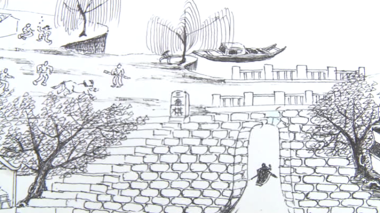 朱河镇有位老人,他剪纸不停,画笔不歇,创作了一幅十米长卷图《朱河古镇图》。老人名叫吴家瑞,今年已经八十三岁。 《朱河古镇图》全长十米,宽0.35米,吴老学习《清明上河图》技艺,采用“散点透视法”,以吴家巷为中心,两端平行铺开,上至仓市,下达棋盘,将古镇十里长街的繁华商业、人文景观集中描绘。 这幅《朱河古镇图》绘有商铺、茶馆、当铺、村舍等景观,共有人物五百多人,商铺两百多间,民宿一百七十栋,家禽七十多只、树木七十多株,长卷真实反映了古镇风貌。