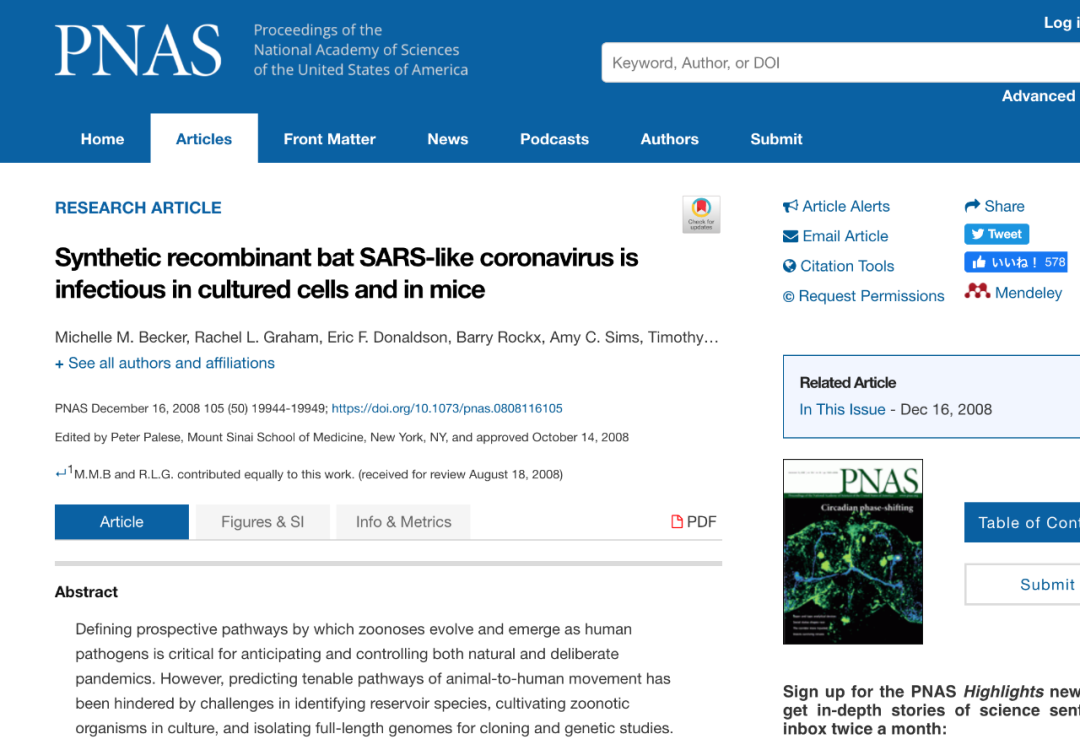美国《国家科学院学报》网站上发表的拉尔夫·巴里克的论文截图。