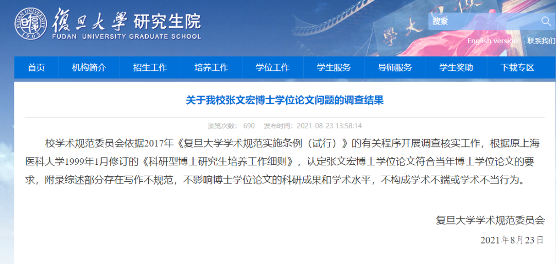 8月23日,复旦大学学术规范委员会在复旦大学研究生院网站公布《关于我校张文宏博士学位论文问题的调查结果》:校学术规范委员会依据2017年《复旦大学学术规范实施条例(试行)》的有关程序开展调查核实工作,根据原上海医科大学1999年1月修订的《科研型博士研究生培养工作细则》,认定张文宏博士学位论文符合当年博士学位论文的要求,附录综述部分存在写作不规范,不影响博士学位论文的科研成果和学术水平,不构成学术不端或学术不当行为。