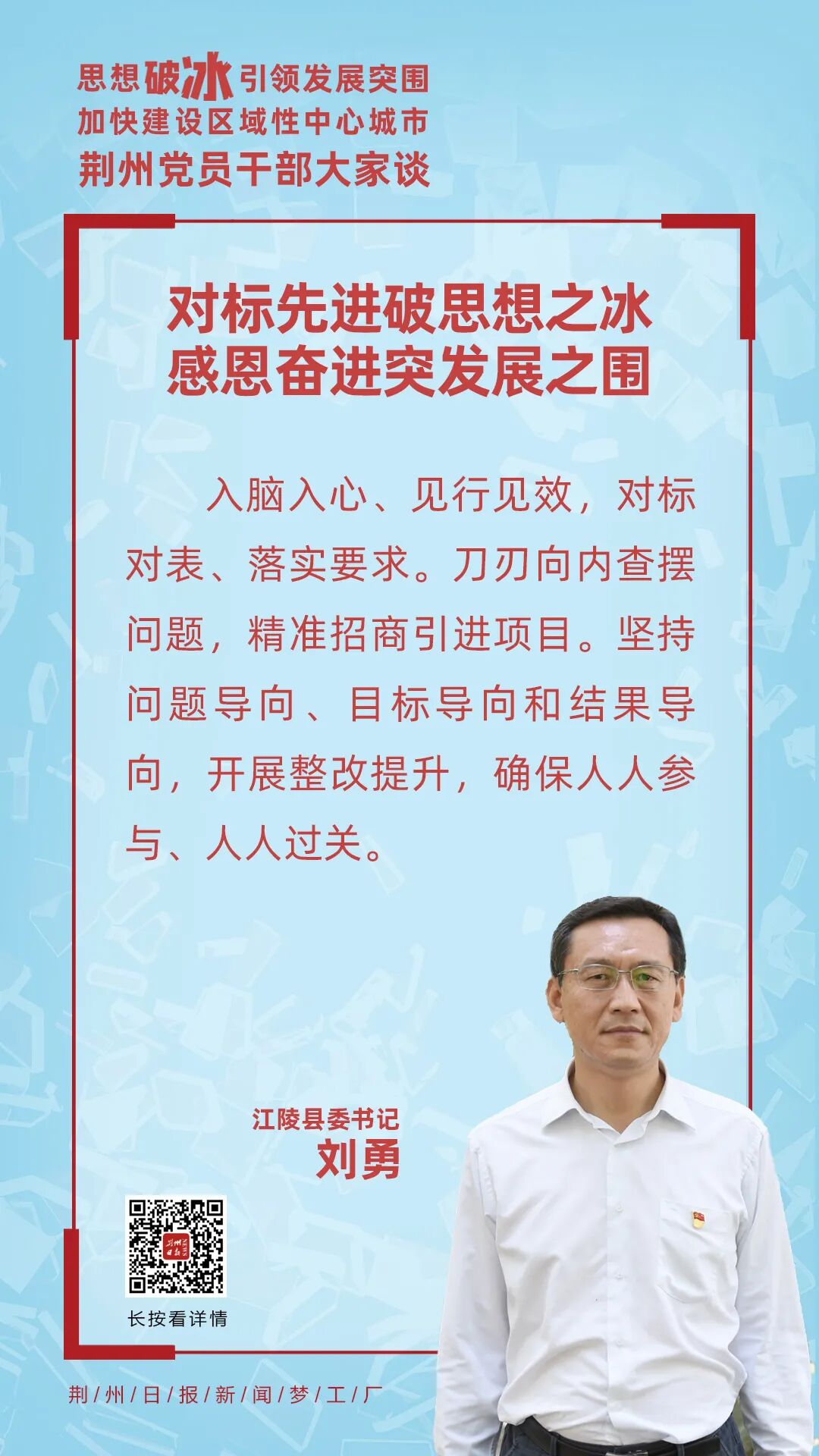 “吴书记的讲话,充分体现了对荆州发展的历史责任感和紧迫感,发出了以思想破冰引领发展突围、加快建设区域性中心城市的动员令,涤荡思想、催人奋进”江陵县委书记刘勇表示,全县上下必须对标对表,落实“严、实、细、深”要求,把好学习交流、查摆检视、调研讨论、整改提升四个环节,将大研讨活动与党史学习教育、决胜全年目标、推动高质量发展结合起来,确保活动取得实实在在的成效。