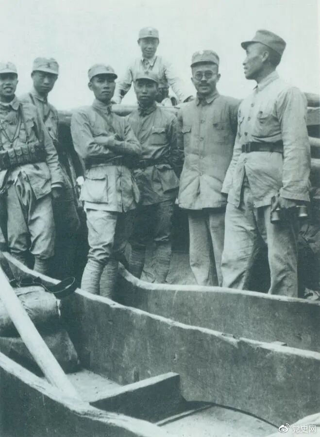 1937年9月,八路军部分领导人率部东渡黄河,开赴抗日前线。图为渡船上的八路军领导人,前排右起:朱德、任弼时、左权。