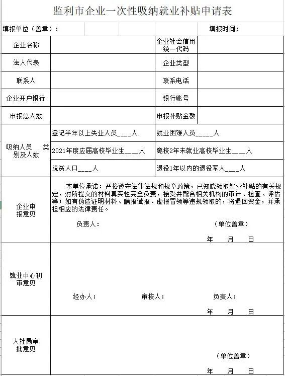 附件1:监利市企业一次性吸纳就业补贴申请表