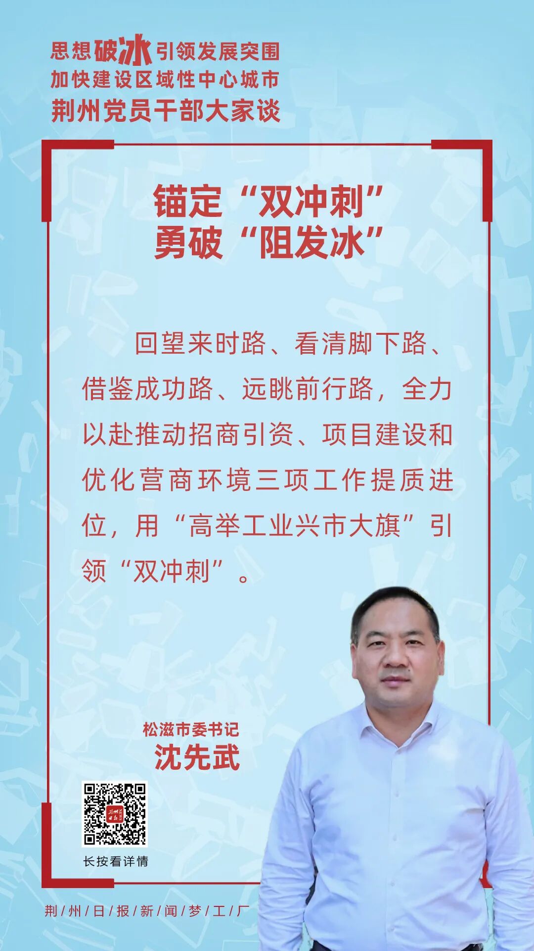 破什么冰?谁来引领?怎么突围?如何保障?松滋市委书记沈先武表示,要以攻坚之志、破冰之举、决胜之力,破除束缚高质量发展之“冰”,勇突发展不平衡不充分之“围”。锚定“双冲刺”目标不松手、不松劲、不松气,全力推动思想破冰、改革发力、发展突围,勇当荆州冲刺全省县域二十强、冲刺全国百强县的“排头兵”。