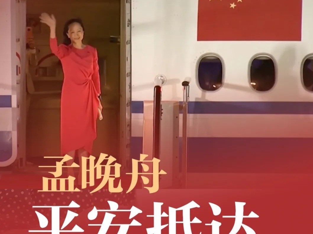 25日晚,孟晚舟乘坐的包机抵达深圳宝安国际机场。舱门打开,孟晚舟走出机舱,向在场人群挥手致意。孟晚舟一身红色衣服,和机身上的五星红旗一样绚丽夺目。