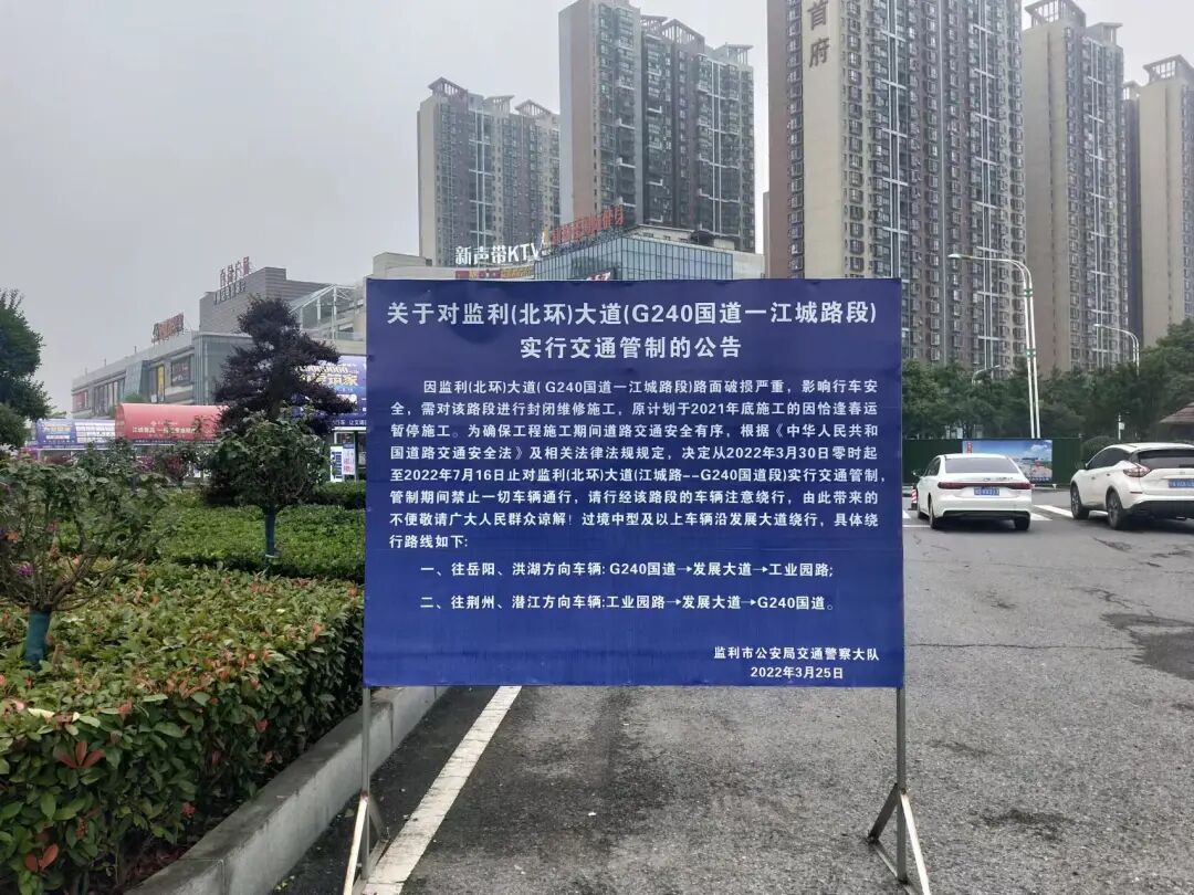 5、从2022年4月24日零时起至2022年7月16日止,对监利(北环)大道(江城路—G240国道段)实行交通管制,管制期间禁止一切车辆通行。
