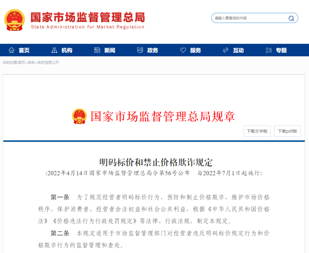 市场监管总局发布的《明码标价和禁止价格欺诈规定》7月1日起施行。《规定》明确了经营者不得实施的七种典型价格欺诈行为,包括谎称商品和服务价格为政府定价或者政府指导价;以低价诱骗消费者或者其他经营者,以高价进行结算;通过虚假折价、减价或者价格比较等方式销售商品或者提供服务;销售商品或者提供服务时,使用欺骗性、误导性的语言、文字、数字、图片或者视频等标示价格以及其他价格信息;无正当理由拒绝履行或者不完全履行价格承诺;不标示或者显著弱化标示对消费者或者其他经营者不利的价格条件,诱骗消费者或者其他经营者与其进行交易;通过积分、礼券、兑换券、代金券等折抵价款时,拒不按约定折抵价款。