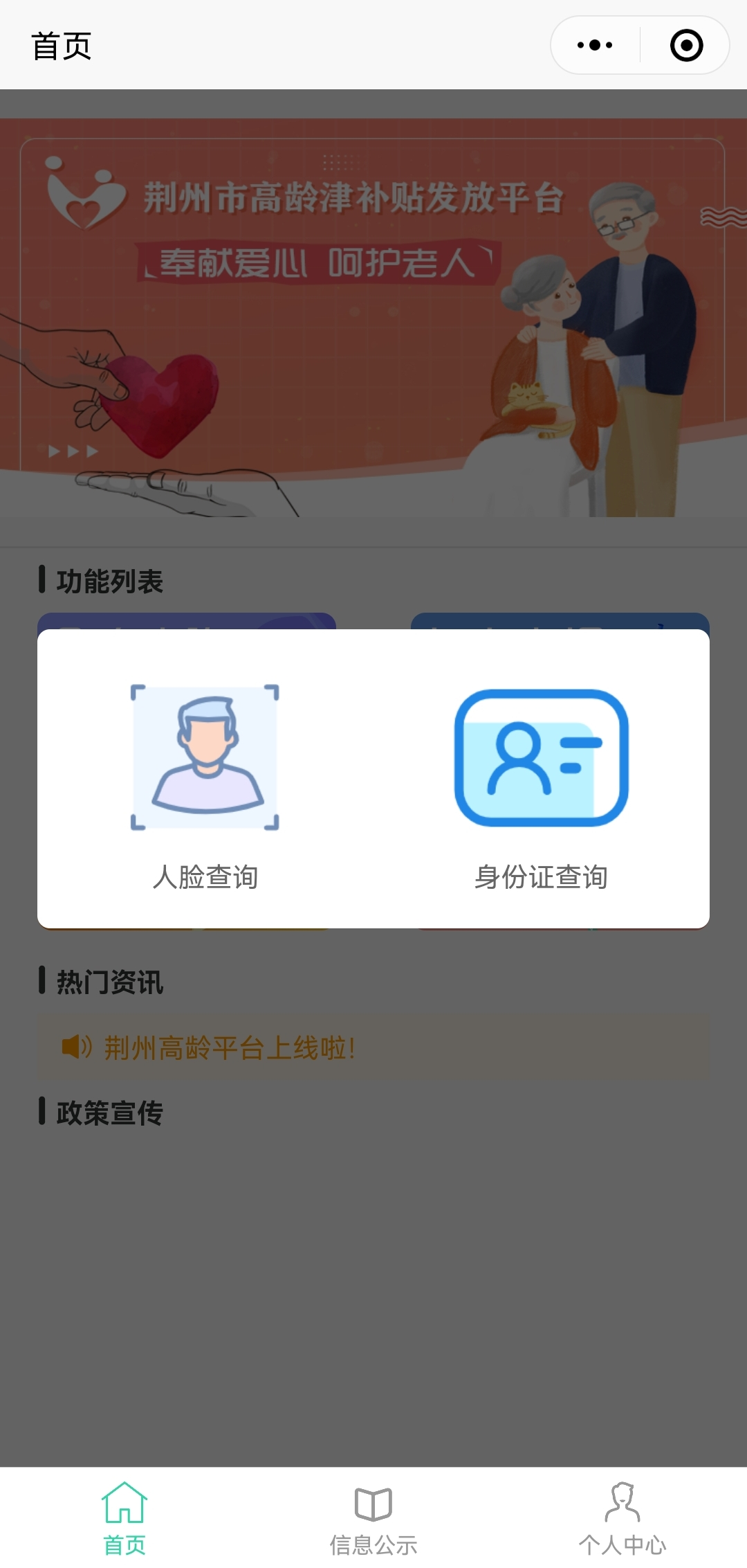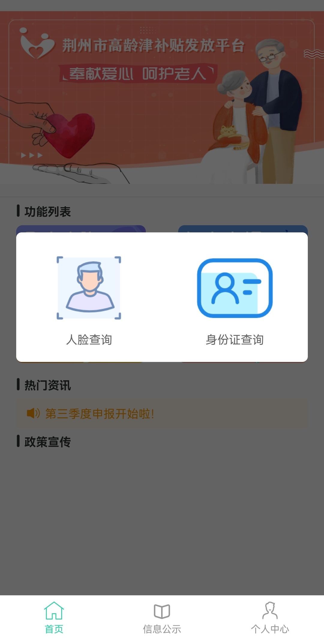 第四步:如需查询办理情况。可点击首页“个人查询”图标,显示两种查询方式:“人脸查询”和“身份证查询”,选择“人脸查询”即可直接通过人脸识别查询申报办理情况和高龄津贴发放情况;选择“身份证查证”,需输入老人身份证号码进行查询。