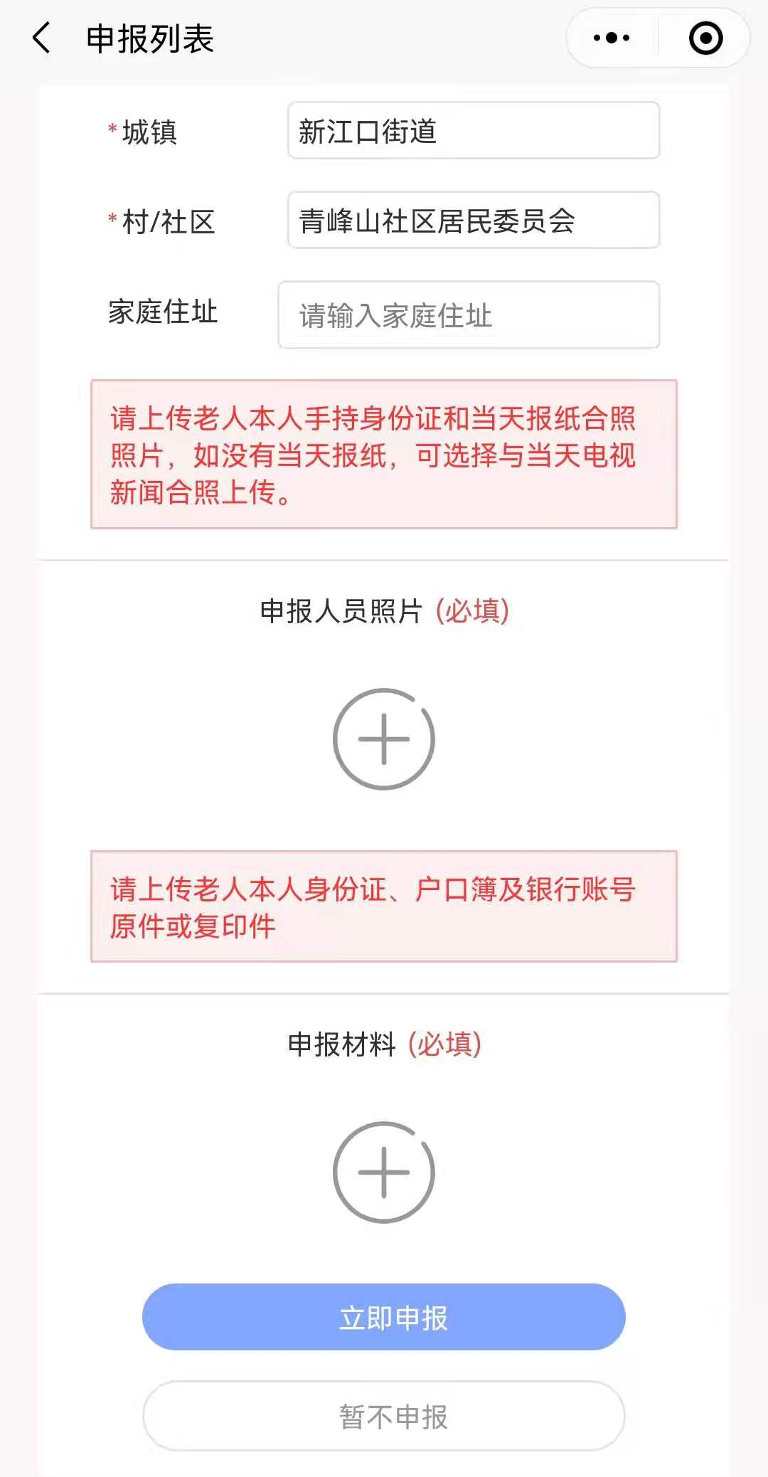第三步:点击首页“自主申报”图标,选择“我要申报”,认真填写老人姓名、身份证号码、联系方式、本人实名银行卡号、开户银行、所居住城镇及村(居)、家庭住址等信息。同时上传老人本人手持身份证和日历或当天报纸的合照照片(如果没有日历或当天报纸,可选择显示当天电视新闻合照上传)。此外还需要拍照上传老人本人身份证、户口簿和银行卡的原件照片。