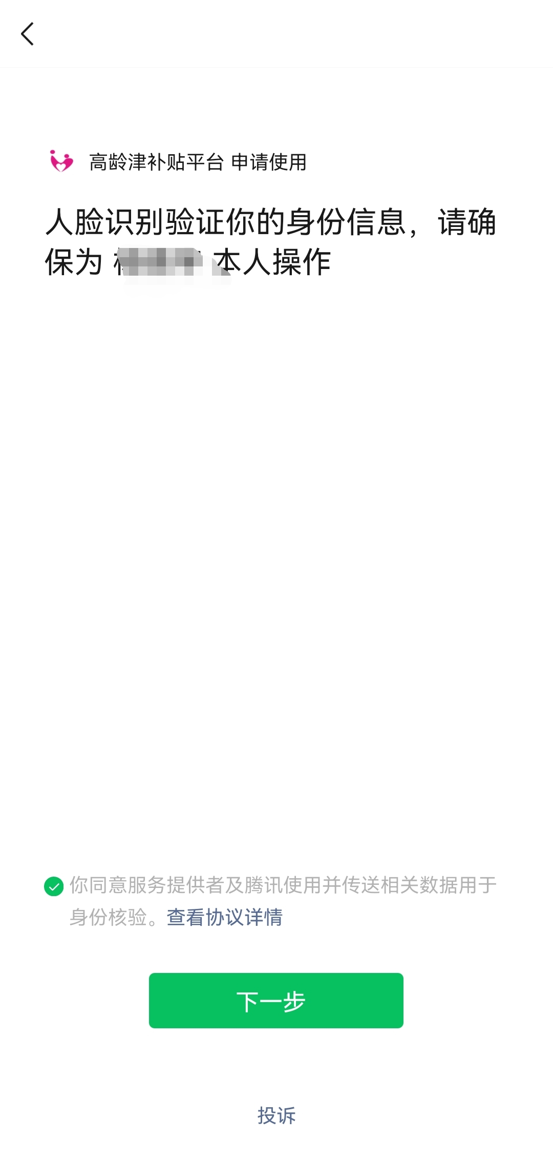 第四步:点击“人脸认证”图标,进入认证界面,首先要确保为老人本人操作,同时勾选“确认协议”。勾选后,才能点击下一步图标。