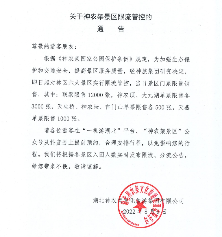 8月5日晚,神农架文化旅游集团有限公司在其微信公众号发布神农架景区限流公告,即日起,神农架六大景区每日对游客数量实行限流,景区联票每天限售12000张。建议游客先预约,再出游。 除六大景区联票限售外,神农顶、大九湖单个景区门票每天各限售3000张;天生桥、神农坛、官门山单个景区门票每天各限售500张;天燕景区门票每天限售1000张。 景区建议游客先在“一机游湖北”平台、神农架景区公众号上预约门票,留意景区发布的游客限流、分流信息,合理安排行程。