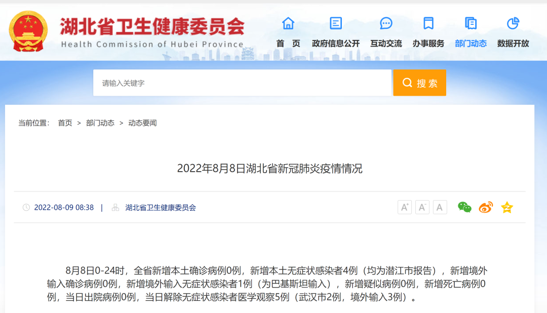 刚刚,湖北省卫生健康委员会官网发布《2022年8月8日湖北省新冠肺炎疫情情况》,全文如下: