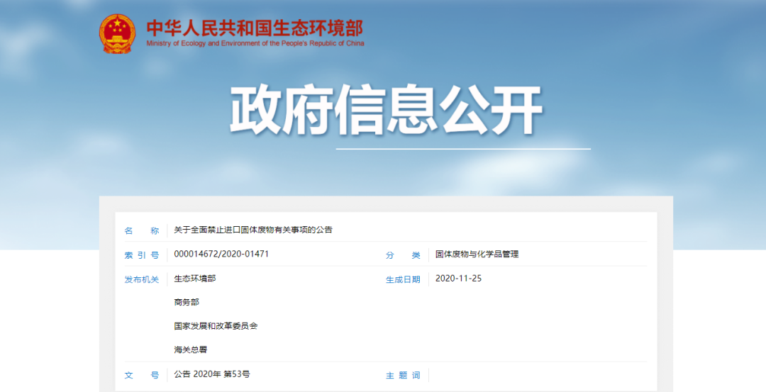 生态环境部、商务部等四部门联合印发《关于全面禁止进口固体废物有关事项的公告》,自2021年1月1日起施行。《公告》明确,禁止以任何方式进口固体废物。禁止我国境外的固体废物进境倾倒、堆放、处置。生态环境部停止受理和审批限制进口类可用作原料的固体废物进口许可证的申请。