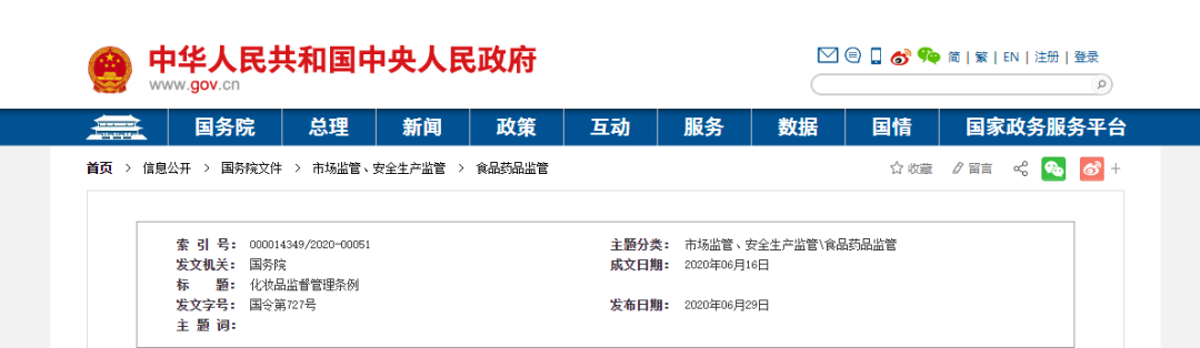 国务院公布《化妆品监督管理条例》,自2021年1月1日起施行。《条例》明确,用于染发、烫发、祛斑美白、防晒、防脱发的化妆品以及宣称新功效的化妆品为特殊化妆品,实行注册管理,注册证有效期为5年。特殊化妆品以外的化妆品为普通化妆品,实行备案管理。化妆品广告不得明示或者暗示产品具有医疗作用,不得含有虚假或者引人误解的内容,不得欺骗、误导消费者。